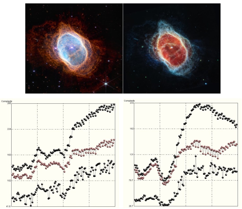 Two images, both of the Southern Ring Nebula in near-infrared light, at left, and mid-infrared light, at right, are confronted and analyzed using QCM tools. The idea is to measure their complexity, which quantifies the amount of structured information, i.e. information deriving from the fact that images contain local structures of pixels.