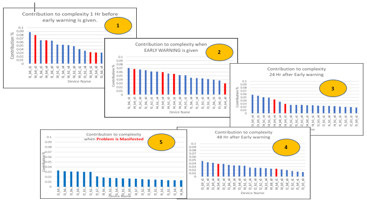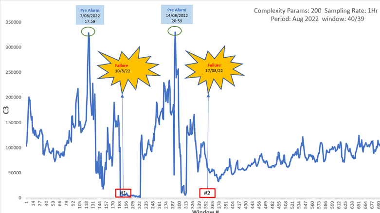 The figure below depicts the evolution of complexity along the monitored period of time. It is evident that there are two sharp increases of complexity, pointing to similar behavior that constitutes indication of an anomaly. As the QCM algorithm computes and analyzes the complexity contributors in each iteration, we can track contributors’ behavioral changes in order to produce recommendations for immediate diagnostic and maintenance actions, well before the actual malfunction occurs.