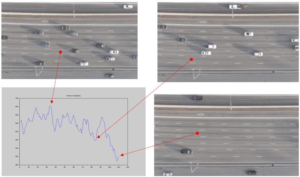 In a previous blog we have shown how complexity may be used in conjunction with streaming video. In this short note we illustrate an example of application of this technology to infer traffic density. The case is that of traffic on a motorway and the video in question is shown at the top of this blog. The video has a duration of 22 seconds and is split into 110 frames. A camera is located above the motorway.