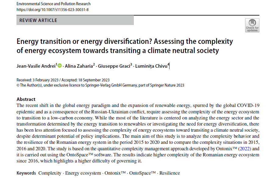 “The recent shift in the global energy paradigm and the expansion of renewable energy, spurred by the global COVID-19 epidemic and as a consequence of the Russian-Ukrainian conflict, require assessing the complexity of the energy ecosystem to transition to a low-carbon economy. While the most of the literature is centered on analyzing the energy sector and the transformation determined by the energy transition to renewables or investigating the need for energy diversification, there has been less attention focused to assessing the complexity of energy ecosystems toward transiting a climate neutral society, despite determinant potential of policy implications. The main aim of this study is to analyze the complexity behavior and the resilience of the Romanian energy system in the period 2015 to 2020 and to compare the complexity situations in 2015, 2016 and 2020. The study is based on the quantitative complexity management approach developed by Ontonix™ (2022) and it is carried out using the OntoSpace™ software. The results indicate higher complexity of the Romanian energy ecosystem since 2016, which highlights a higher difficulty of governing it.”