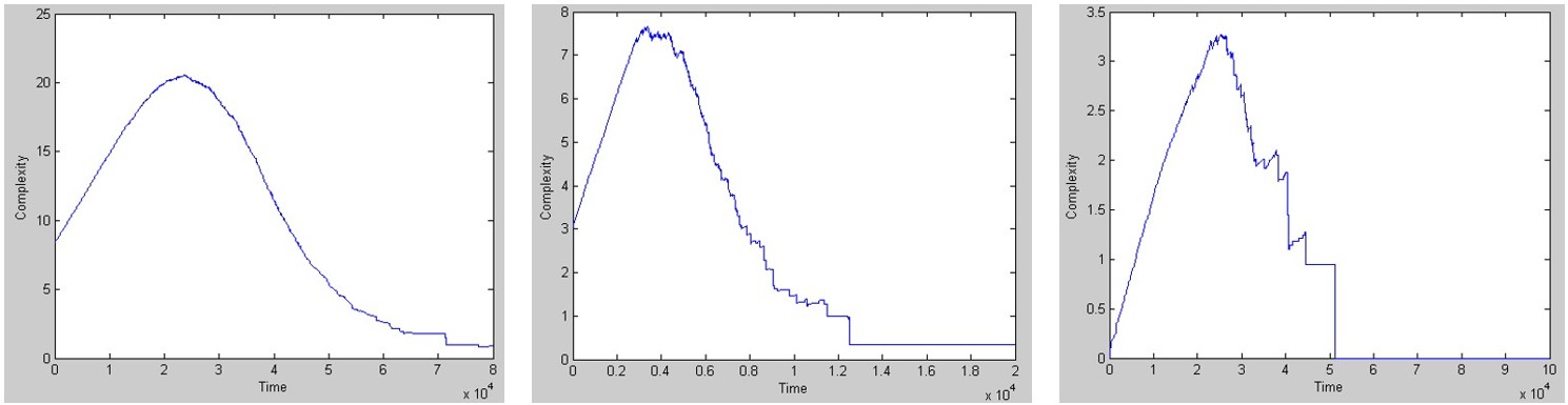 Our complexity metric has been applied to a myriad of systems over the years, ranging from stock markets and corporations, to hospitalized patients or proteins, or industrial processes and engineered products. It explains how a system needs a minimum, initial amount of complexity to survive and grow, how it evolves, attaining a maximum complexity level, and then decays, more or less gracefully, towards a certain “death”. The figure below shows the evolution of complexity of three systems. The one on the left grows and ages smoothly without incidents, while the one on the right undergoes a traumatic collapse. A loss of complexity implies a loss of functionality (and vice versa). If this is due to the failure of a critical component, this loss is faster and more pronounced.