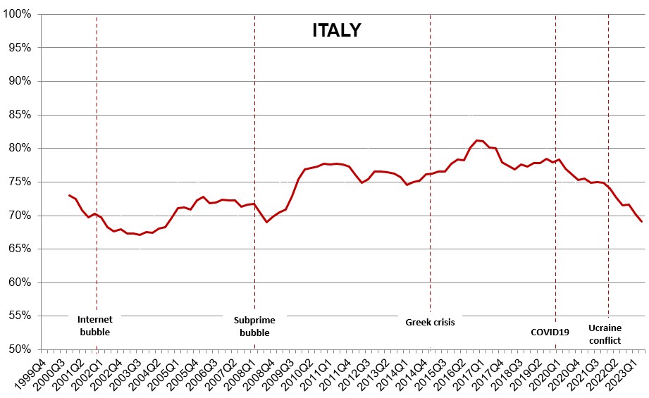 It is evident that Italy’s resilience variation since Q1 2020 has been the most dramatic. We are speaking of a massive drop of 12%. There is no indication that the trend is going to change. So much for the National Recovery and Resilience Plan! What is surprising is that in the period 2015-2017, Italy had the highest resilience of 80%, far more than France and Germany.