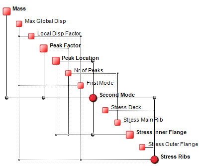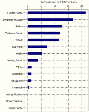 The corresponding Complexity Profile, illustrated below, shows how the design variables which drive complexity – and ultimately robustness – are the ones at the top of the bar chart, i.e. “T Outer Flange”, “Dimension Fraction” and “Radius”. These three variables alone control approximately 40% of the system’s complexity, hence robustness. In particular, it is the variability of these parameters – due to tolerances, imperfections, etc. – that must be reduced if the robustness of the system is to be increased.