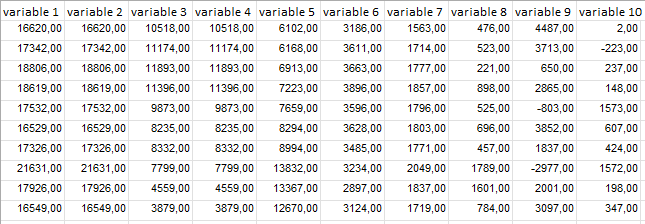 Variable 10 has the largest footprint – just over 30% – and therefore it is the most important variable within the given data set. Variable 8, on the other hand, has almost no impact within the space spanned by the data. Should the above data represent a situation requiring a decision, variable 10 would be the priority. Together with the following three variables (7, 1 and 2), the top four embrace approximately 75% of the problem at hand. All this is done without Machine Learning. Artificial Intuition has never “seen” this piece of data before.