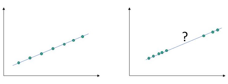 In the image below, linear correlations are both equal to 100% and, worse than that, the regression models are identical. Evidently, if one doesn’t actually see the underlying data and relies on the model, the consequences can be unpleasant. The model on the right hand side is not valid in the region between the two clusters. Assuming blindly that it is, is risky, to say the least. Continuity must be verified each time.